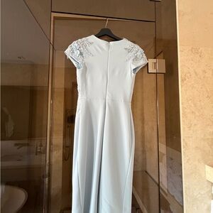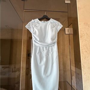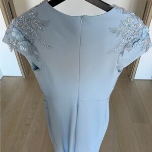 light blue dress features floral embellishments, perfect for any special occasion, bridal shower, dinner etc. never worn. Size 6 will fit size 4 too or can be tailored easily. Excellent new condition