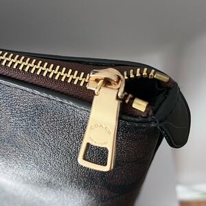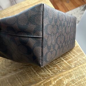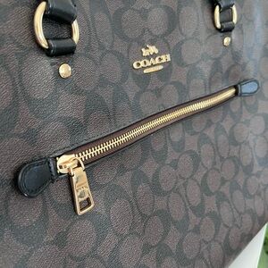 Elevate your style with the Coach Brown Signature Tote Bag. This elegant bag features a classic design with black handles, perfect for any occasion. See last couple photos for flaw in stitching and zipper. Zipper IS operational.