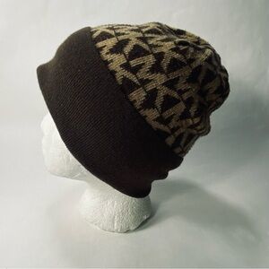 Michael Kors Knit Cuffed Beanie Foldover Hat Tan Brown Logo Pattern