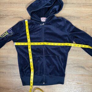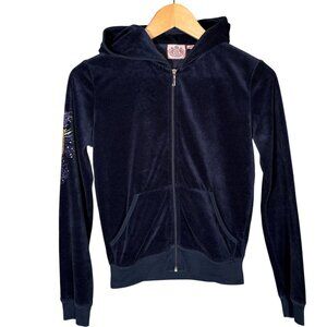 Juicy Couture Navy Blue Velour Hooded Zip Up Graphic Back Y2K XSP