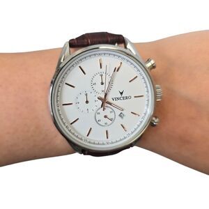 Vincero Men's Watch 43mm Silver Rose Gold Brown Leather. Elegant Vincero watch with a silver face and brown leather strap. Features a chronograph design. Upgrade your style with this sleek Vincero men’s chronograph watch, perfect for everyday wear or dressing up. This watch features a clean, modern design with a durable genuine leather strap and a stainless-steel case for a bold, classy look. Stainless steel case. White dial with rose gold accents. Silver clasp. Water resistance 5 ATM.