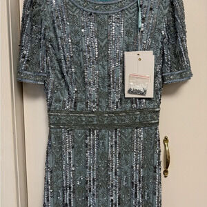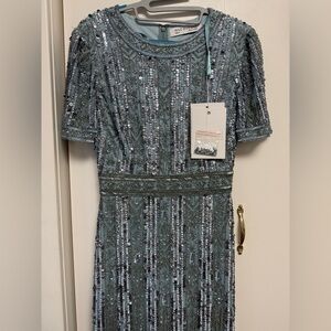 NWT | Mac Duggal Blue High Neck Short Sleeve Crystal Fringe Column Dress Size 6
