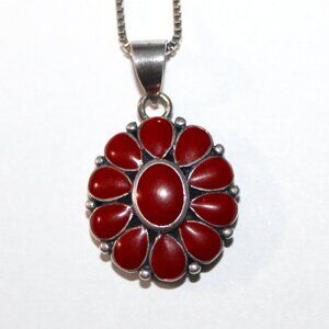 Sterling silver set with red resin in an abstract almost floral design and on a box chain.