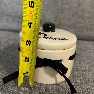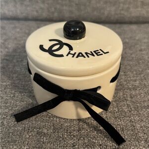 Chic CHANEL round jewelry holder. Features a sleek velvet bow and iconic logo.