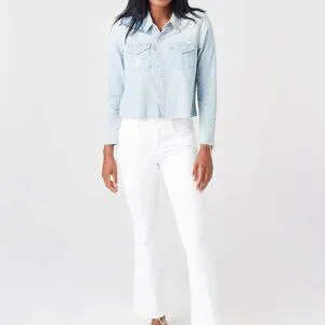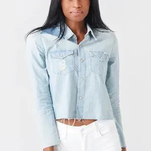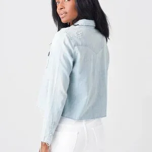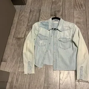 Rock the Mother Women's The Super Ex's Crop Fray Button-Up Shirt Jacket for some extra edge. EUC