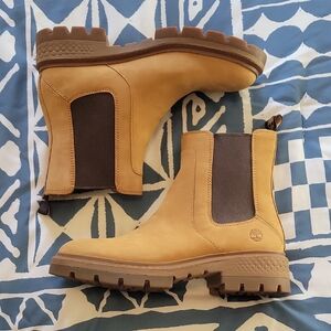 Stylish and rugged Timberland ankle boots. Brown leather with elastic side panels. Perfect for versatile wear.