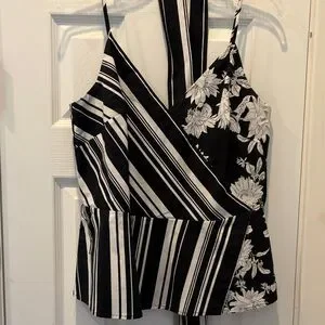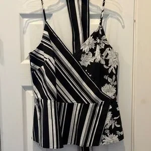 Reposhing as it is a little too low cut for work. Tags have been removed and laundered but never been worn. Stylish black and white top with floral and striped patterns. Features a flattering wrap design and adjustable straps.
