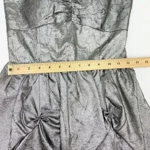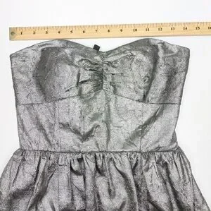 Shine bright and get ready to steal the spotlight at any party or event with this stunning metallic silver strapless mini dress from Le Chateau.