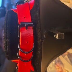 Unique red necklace featuring a robot charm with decorative chains and feather detail. The choker is made of PU leather, an animal-friendly accessory that is a conversation piece at any gathering.