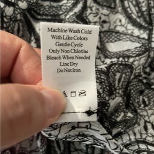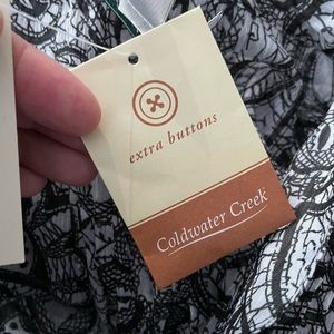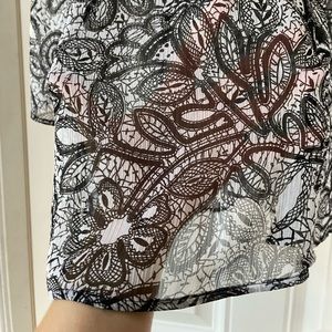 Sheer. Black and white paisleys pattern. Buttons up the front. Spare button included. Casual business casual
