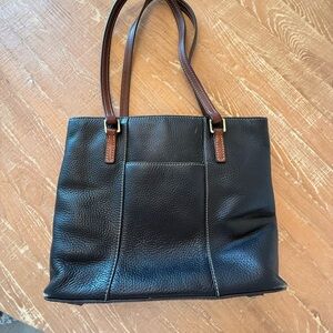 Elegant black leather tote. Features rich brown straps. Ideal for daily use. Worn, price reflects. Still lots of use.