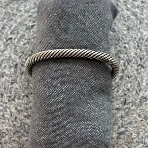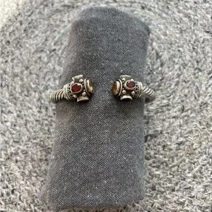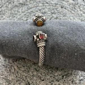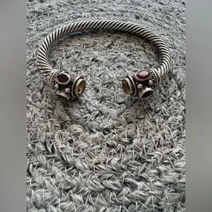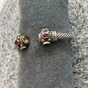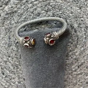 Elegant sterling silver cuff bracelet with garnet and citrine stones. Intricate design with a twisted band.