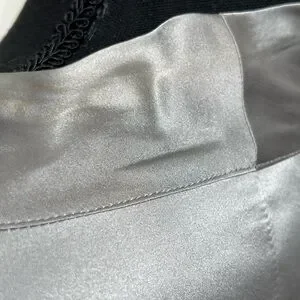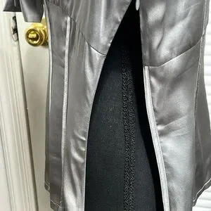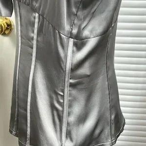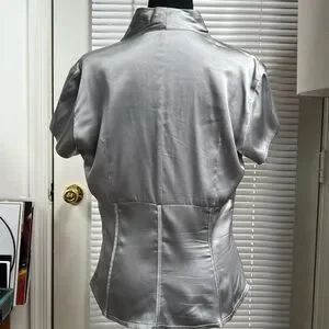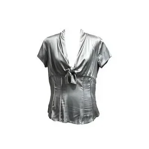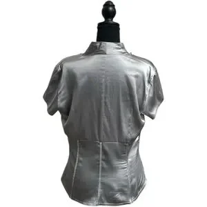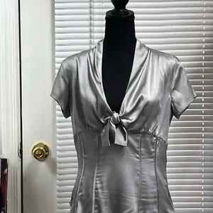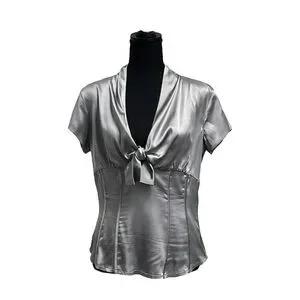 This stylish blouse features a chic tie front and cap sleeves, crafted from a lustrous silver fabric. Its fitted design accentuates the waist, offering a sleek and sophisticated look for any occasion.