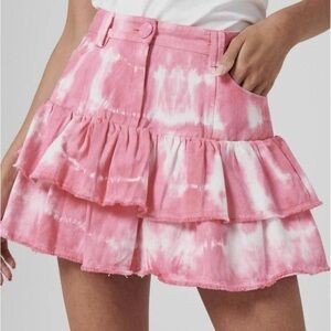 Vibrant pink and white mini skirt. Features layered ruffles. Adds a playful touch.