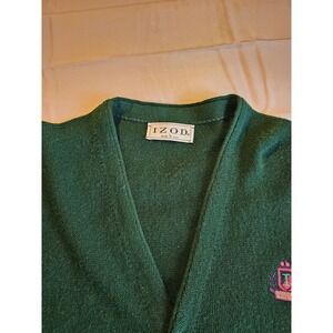 This Vintage Izod Men's L Green Acrylic Cardigan Sweater Made in the USA features a classic design with a crest detail, perfect for adding a touch of timeless style to your wardrobe.