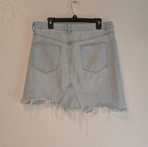Denim mini skirt with five pockets design and asymmetrical distressed hem, button fly.