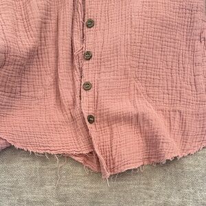 Chic blush top with frayed edges. Lightweight and textured fabric. Perfect for casual wear.