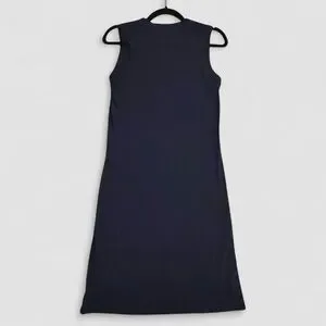 Effortless and versatile sleeveless navy dress by Southcott, crafted in the USA from a super soft blend of 66% rayon from bamboo, 28% cotton, and 6% spandex. Features a V-neckline and subtle high-low hem (approx. 35” front, 37” back) with side slits for ease of movement. Bust measures about 16” across when laid flat. This dress is a Southcott size 1, which is their own size chart. Please see above measurements and pictures. I think it fits like a small.