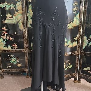 Elevate your style with this exquisite black high-low skirt, adorned with elegant embellishments. Perfect for any fashionable event. The waist measures 29 inches.
