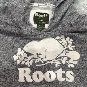 Soft charcoal hoodie with classic Roots logo. Ideal for casual outings. Is in good condition minus the couple small marks shown in photo. Aren’t too noticeable when wearing