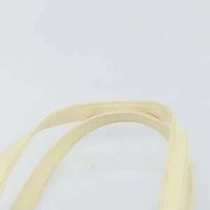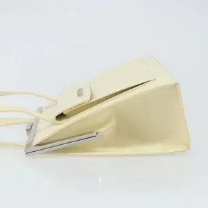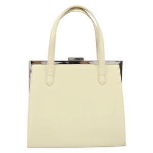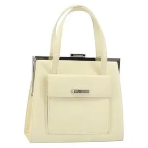 Elegant cream satchel with sleek design. Features a front pocket and silver/metallic accents. Ideal for any occasion. Excellent condition.