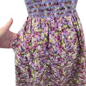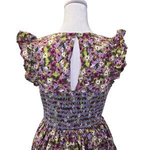 This dress features a smocked bodice, a round neckline, ruffle details at the shoulders, and a flared midi skirt. Side pockets. Keyhole button closure at the back. The shell is 100% Cotton, with a lining of 80% Polyester and 20% Cotton.