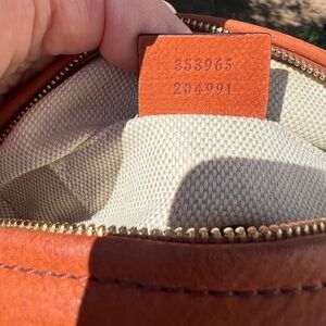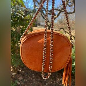 Gucci Soho Interlocking GG chain and tassel mini bag. Orange nubuck leather. Slight discoloration on outside of bag. Slight discoloration on leather intertwined strap. Inside cloth interior clean. Slight scratches on hardware. Overall in good condition for reloved bag. Too cute!