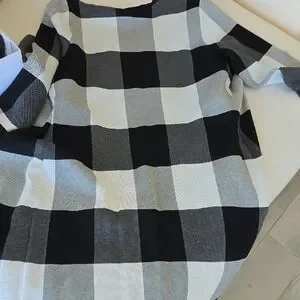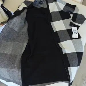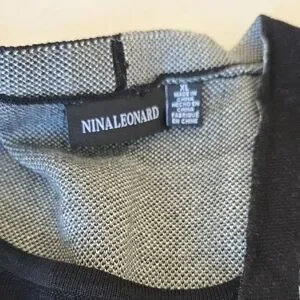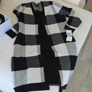 Stylish long sleeve duster dress by Nina Leonard. Features a bold black and white checkered pattern. Perfect for any occasion.