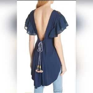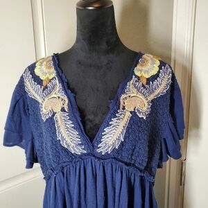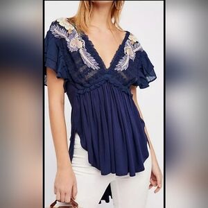 Free People Fiesta Nueva Floral Embroidered Navy Blue Tunic Top Retail $128.00