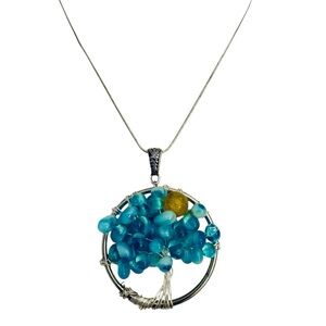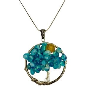 This captivating Tree of Life pendant features a hand-crafted silver wire circle adorned with smooth turquoise blue gemstone chips, representing leaves of vitality and renewal. A single golden-amber bead shines like a sun within the branches, adding warmth and balance. Suspended from an elegant silver bail and chain, this necklace blends natural beauty with symbolic meaning — harmony, growth, and positive energy.