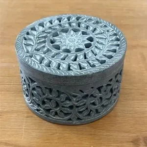 Hand Carved Soapstone Trinket Box Round Floral Lidded Jewelry Keepsake Gray
