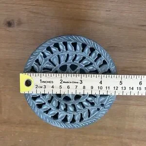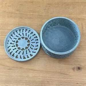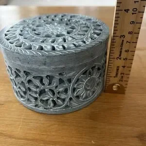 Description: Beautiful hand carved soapstone trinket box featuring an intricate floral and vine relief design with pierced lid and sides. Solid stone construction with a smooth interior and removable lid. Perfect for jewelry, crystals, keepsakes, or as a decorative boho or global-inspired accent piece. Gray stone with natural variations gives it a unique artisan look. Good preowned condition with light surface wear and minor marks consistent with use and age.