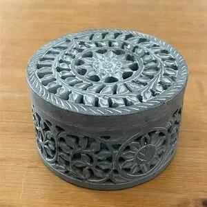 Style Tags: soapstone, carved stone, trinket box, jewelry box, boho decor, global decor, handmade, floral, cottagecore, vintage style, meditation, gift