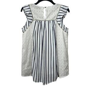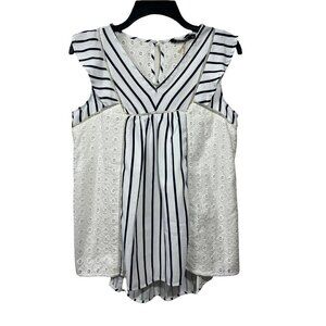 Doe & Rae High Low Ruffle Sleeveless Top Crochet Lace Blue White Striped V-Neck Lined Size Small