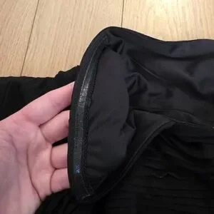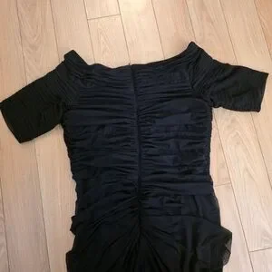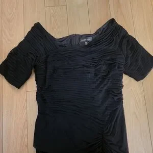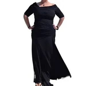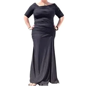 Pre-loved Tadashi Shoji Off the Shoulder, 1/2 Sleeve Formal Gown. Size XXL with stretch, see measurements. Color is black. Pintuck and ruching throughout. Has rubber stripping at the shoulders to hold it in place. Zips up the back. Slightly longer in the back. Has a liner. Polyester, spandex, and nylon. Style# 738814LX. RN# 62825. I bought this for a wedding in 2020 that got canceled and I couldn't return it. Only wore it to try on and take pix for this listing.
