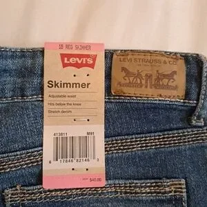 Levi's girls size 16 skimmer jean shorts. They have an adjustable waist, nice amount of stretch, 3 front, 2 back pockets, hits below the knee