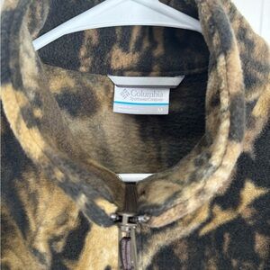 Warm fleece jacket with a woodland pattern. Ideal for outdoor activities. Features a full zip and high collar.