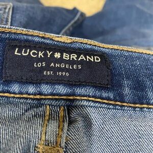 Lucky Brand women’s skinny jeans in a rich dark blue wash with light distressing for a lived-in, stylish look.