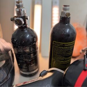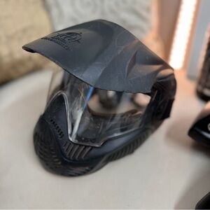 Lot Black Paintball Gear Set 2 mask. 3M ear protectors, 6 hoppers, 2 gas pipetts