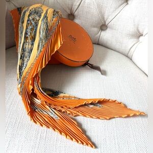 Hermès Vintage Plissé Silk Scarf Orange/Gold & Blue Equestrian + Box