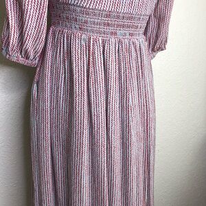 Hatch Briar sky blue red dashdot smocked waist maternity dress. Pullover style with scoop neckline. Buttons at front neckline. Smocked elastic waist. Midlength sleeves with elastic cuffs. Layered hemline. Double side pockets. Fully lined. Size 2 or Medium. Excellent preowned condition. Minor wash wear.