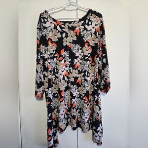 Chic floral tunic by Woman Within. Features a striking black, orange, and cream pattern. Perfect blend of style and comfort.