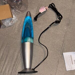 Enhance your home with the this beautiful blue and silver lava amp. Featuring a captivating blue water with a lighter blue wax inside a glass with a beautiful sleek silver base. This lamp adds a touch of elegance to any room.