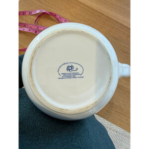 This is a pre-owned RP Home white ceramic pitcher, featuring a classic round body with a wide mouth and a sturdy handle. The pitcher has a glossy finish and a small pouring spout. The base shows the "RP Home Handcrafted" logo with care instructions in English and French, indicating it is microwave, oven, and dishwasher safe, and made in Portugal. Visible signs of wear include some minor scuffs and discoloration on the bottom rim. The pitcher measures approximately 9 inches in height.