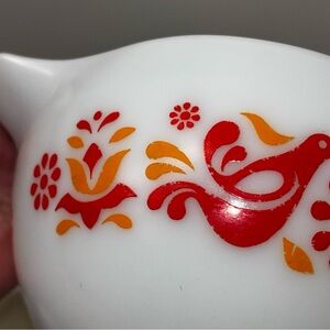 Pyrex vintage Friendship Cinderella mixing bowl 441 (the smallest). This vibrant red and orange bird pattern is a hard to find and sought-after design. The 441 size is the smallest in the nesting set, with a 1.5 pint capacity.