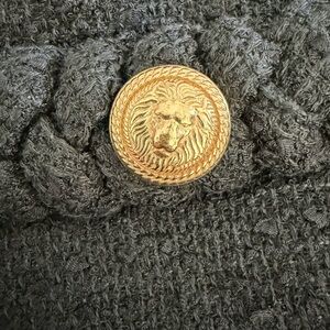 Gold crest buttons at faux pockets