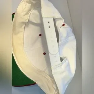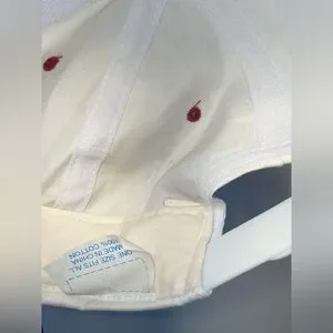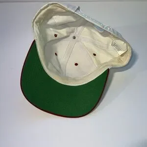 Classic 1990s aesthetic with a cream-colored crown and a contrasting red brim.