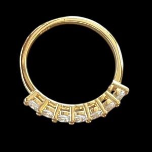 925 Sterling silver Moissanite Elegant half-eternity band features a row of seven shimmering round-cut clear stones set in a classic four-prong arrangement. The yellow gold-tone finish provides a warm, sophisticated contrast to the brilliant stones, making it a versatile piece for stacking or wearing alone. Crafted with a slim, polished band, this ring offers a timeless aesthetic suitable for weddings, anniversaries, or everyday luxury.