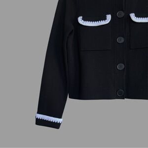 SEZANE Black Merino Wool Knit Collared Betty Cardigan Sweater w/ White Crochet Details