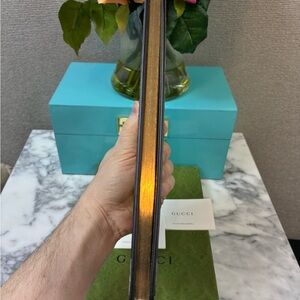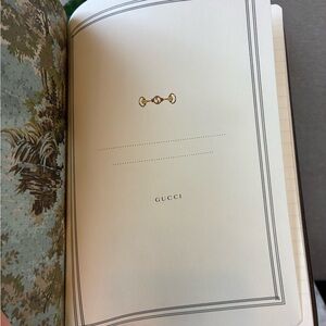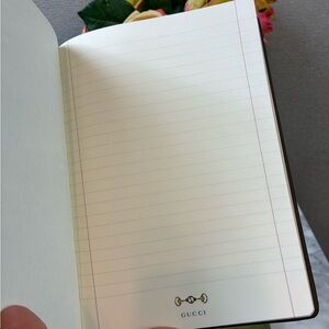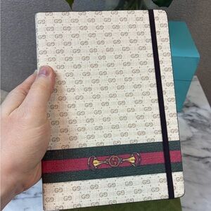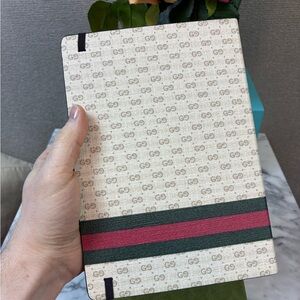 Beautiful Gucci leather notebook. GG pattern with Horsebit & green/red stripe. All pages labeled Gucci with gold trim. Comes with all original tags, dust bag, and box.